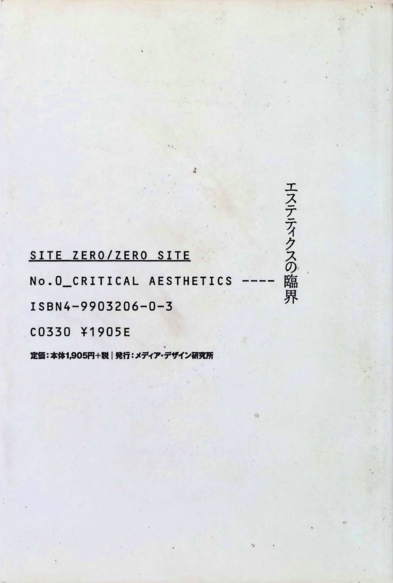 戻る 資料 / 02 新聞・雑誌 / 02-01 専門誌/専門紙 SITE ZERO/ZERO SITE No.0 エステティクスの臨界 サイトゼロ ゼロサイト ナンバー ゼロ エステティクス ノ リンカイ SITE ZERO/ZERO SITE No.0 CRITICAL AESTHETICS 作者・著者 飯田 豊 (イイダ ユタカ) 南後 由和 (ナンゴ ヨシカズ) 他 出版元 メディア・デザイン研究所, 東京 年 2006 ISBN 4990320603 サイズ(cm) 17.2 x 11.8 x 2.5 ページ 447 その他詳細 「メディア文化としてのグラフィティ 『Fine』から『KAZE MAGAZINE』へ」収録