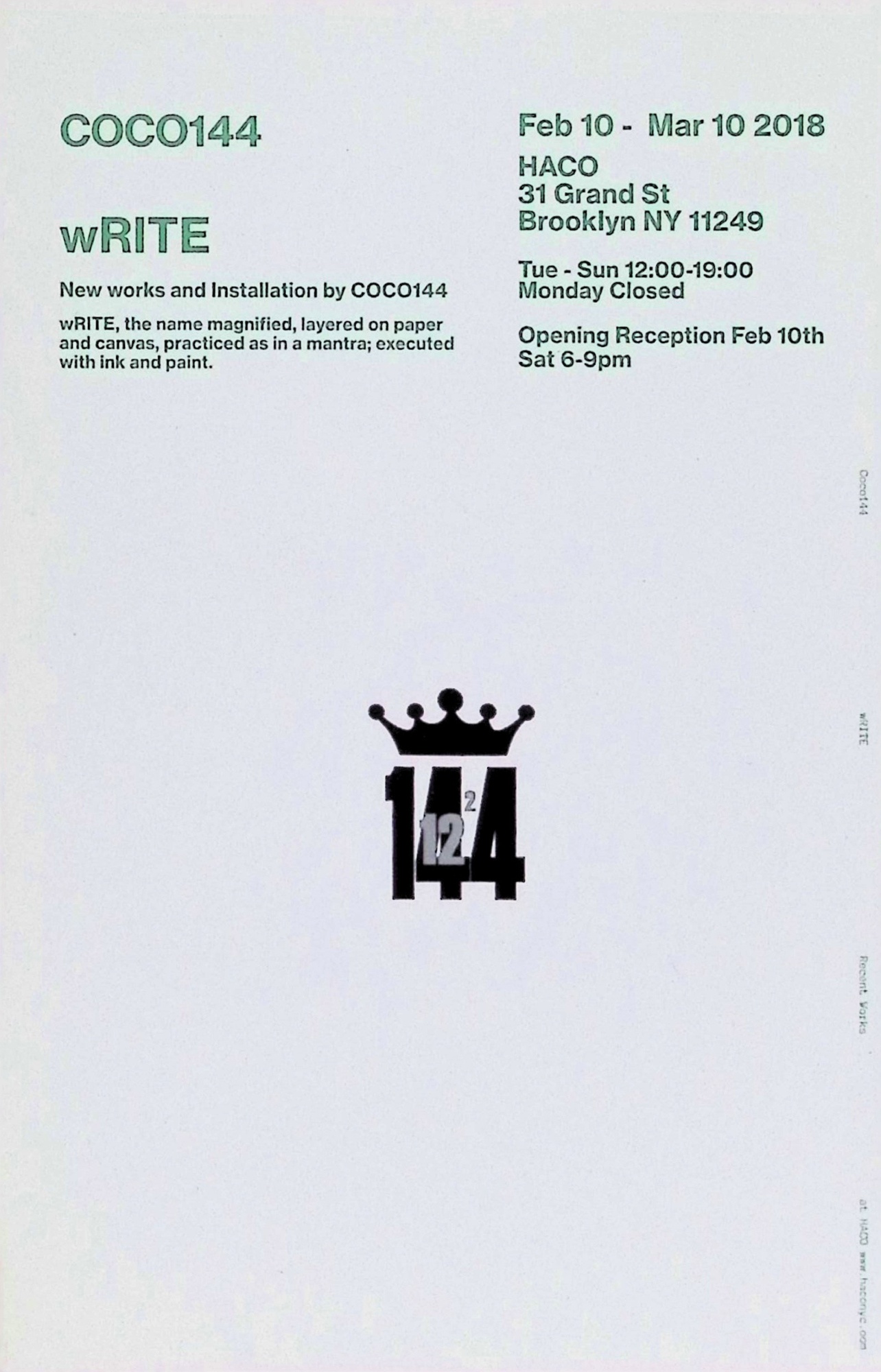戻る 資料 / 04 印刷広報物 / 04-01 DM/フライヤー COCO144 wRITE 出版元 HACO NYC, ニューヨーク 年 2018 サイズ(cm) 21.5 x 14 重量(g) 10